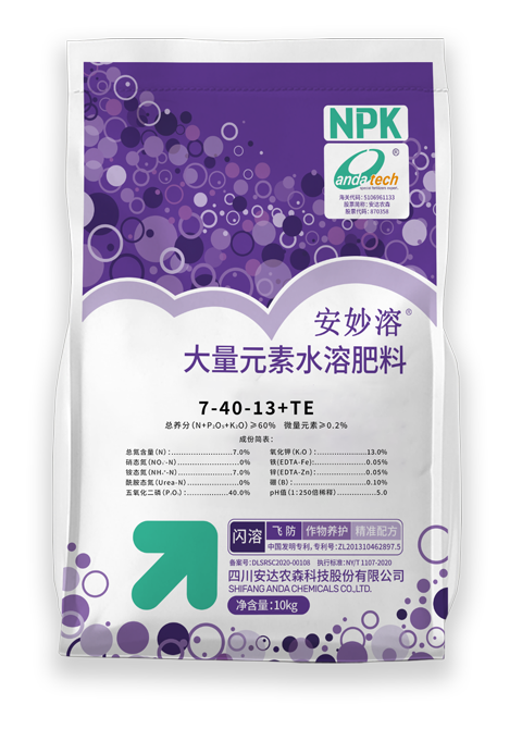 7-40-13+TE; 7-5-42+TE; 0-38-38+TE; 5-5-45+TE; 其他 包裝規(guī)格 10kg/袋 1、采用獨特的專利生產工藝(專利號:ZL202322591469.4),產品溶解速度快,吸收利用率高,見效快; 2、產品配方科學多樣、針對性強,能促進作物提苗、膨果、轉色等; 3、產品特別添加增效因子ATBT(專利號:ZL201310462897.5),是公司自主研發(fā)的水溶肥添加劑,能促進作物對營養(yǎng)的吸收利用,提高作物品質。