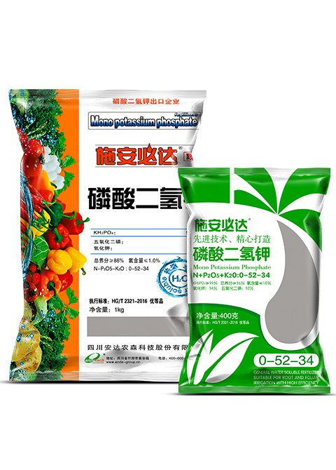 產(chǎn)品含量:0-52-34 技術(shù)指標:主含量≥99% pH:4.4-4.8 包裝規(guī)格 400g/袋、1kg/袋 產(chǎn)品介紹:本品易溶于水、溶解快、具有純度高、吸收好、使用安全等特點,能顯提高作物的光合作用,促使莖稈粗壯,根系發(fā)達。有效促進花芽分化,催花促果,增加果品甜度。
